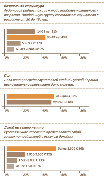 Предприниматели, домохозяйки, студенты, семьи, холостяки или дети – Радио Русский Берлин является верным спутником жизни около 350.000 жителей Берлина и окрестностей, которых объединяет знание русского языка и культуры. Также для тысяч русскоязычных туристов Берлин – излюбленное место для отпуска, а Радио Русский Берлин – лучший источник информации на русском языке. Немецкие слушатели, интересующиеся русским языком, культурой и музыкой, также являются частью аудитории Радио Русский Берлин. Одним словом, радиослушателей можно охарактеризовать как молодое и активное население, ориентированное на высокие стандарты потребления. Русскоязычные жители Берлина за последние годы превратились в группу населения, отличающуюся высокой покупательной способностью, ярко выраженным предпочтением брендовых товаров и стремящуюся к высокому жизненному уровню. * данные радиостанции по состоянию на октябрь 2015